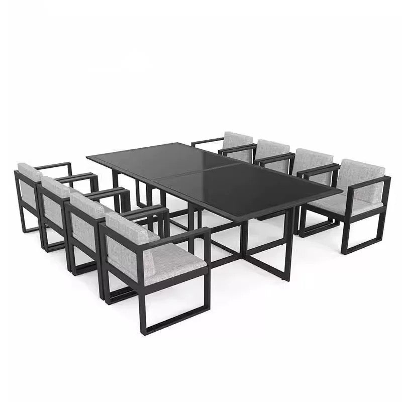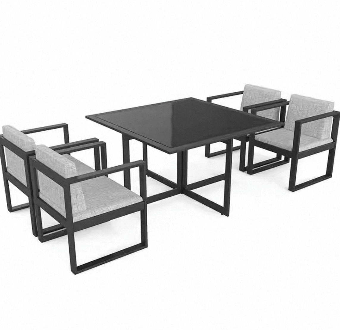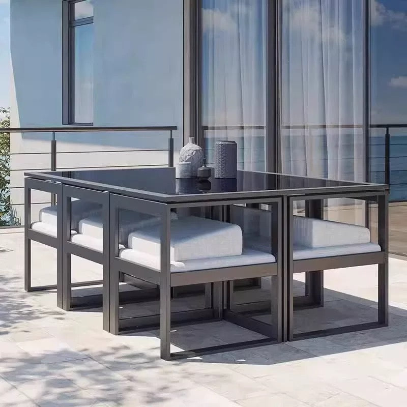 The MACY Outdoor Dining Set serves as an ideal enhancement for outdoor spaces, facilitating gatherings with family and friends. This dining set is designed for outdoor relaxation, irrespective of varying weather conditions. It features water-resistant cushions that provide significant comfort, encouraging extended periods of use. The best part is all the chairs can be pushed under the table, making it a compact set that is space saving!
